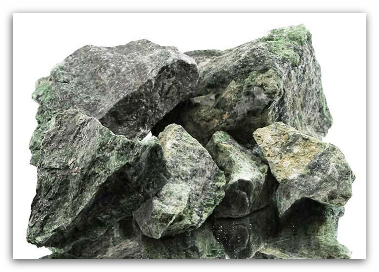 Diopsiet als ruwe steen in verschillende tinten groen, maar meestal met een sterke groene kleur.